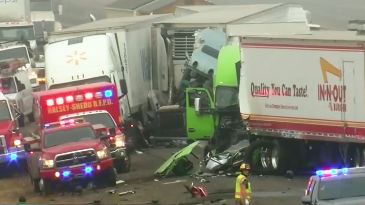 El choque, que involucró a una veintena de vehículos comerciales y 45 vehículos de pasajeros, tuvo lugar en un tramo de la carretera Interestatal 5, a la altura del condado de Linn. El incidente se agravó por el líquido de varios camiones que se vertió sobre la autopista y se cree que podría haber sido ocasionado por una espesa niebla.