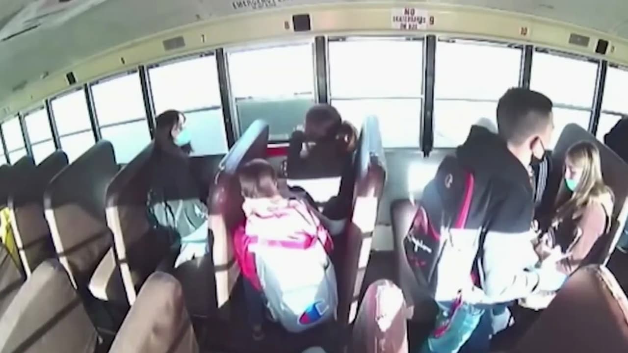 En video quedó captado el momento en que un Mustang blanco impactó el costado de un autobús escolar en Nuevo México. Las cámaras en el interior del transporte, que llevaba a 23 estudiantes, grabaron cuando los menores salieron volando tras el choque; se reporta que varios alumnos fueron llevados al hospital, dos de ellos con heridas graves.