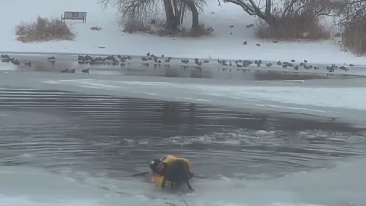 En video quedó registrado el momento en el que un bombero se arrastra hasta el borde de un estanque helado y se deja caer al agua para poder poner a salvo a un perrito que estaba temblando en medio de