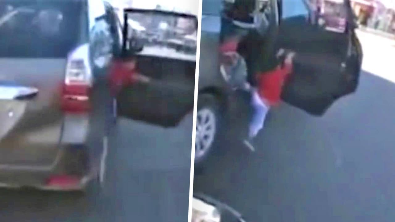 Un motociclista captó en video cuando un niño pequeño, que iba a bordo de un auto en movimiento, se aferra con todas sus fuerzas a la puerta del vehículo que se abrió cuando dio la vuelta en la carretera; afortunadamente el menor no resultó herido.