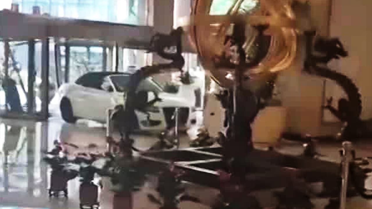 Un huésped que se molestó con los trabajadores de un hotel de lujo por la pérdida de una computadora portátil, impactó con su vehículo contra la puerta del vestíbulo y posteriormente manejó de forma errática dentro de este. Afortunadamente, no se reportaron heridos.