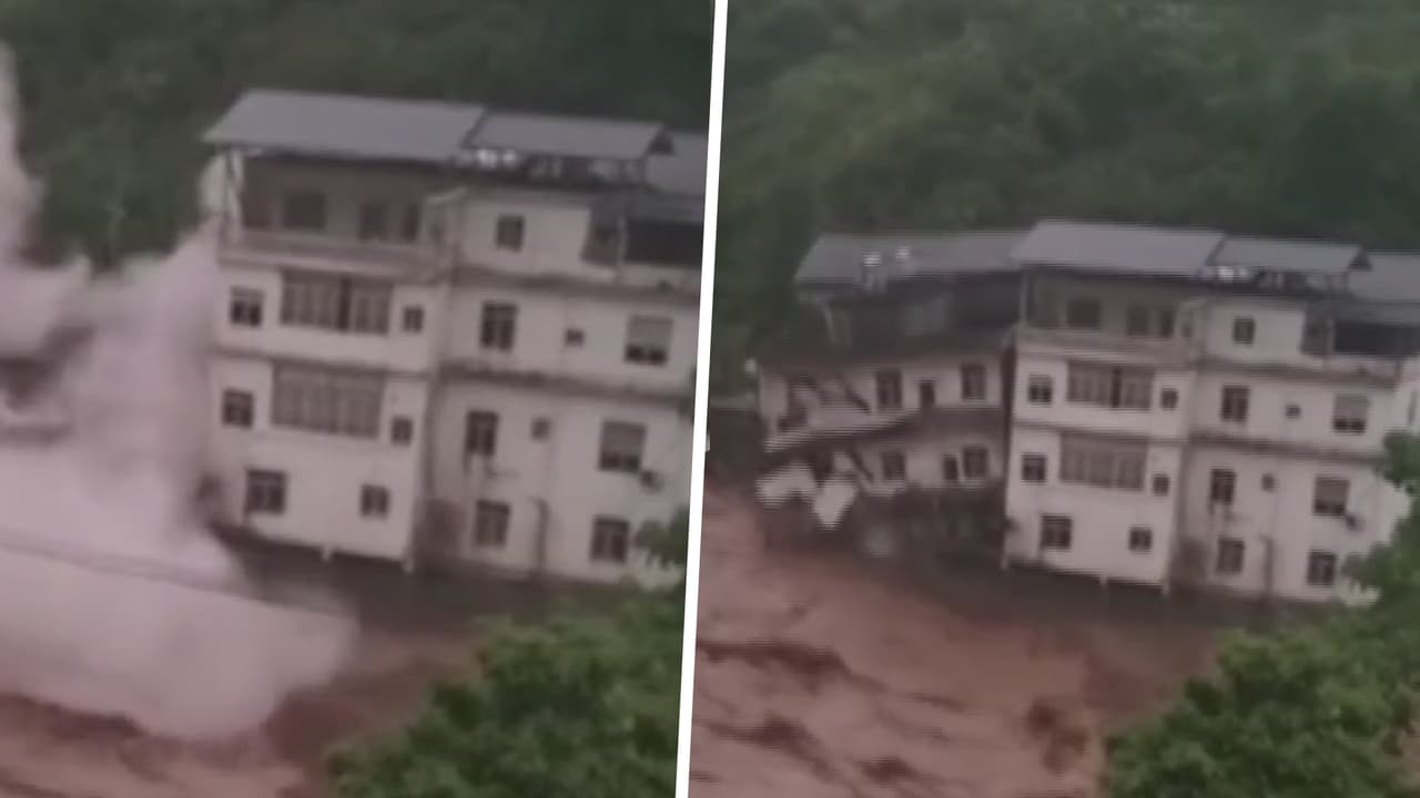 Un edificio se derrumba en medio de las inundaciones en el suroeste de China, los primeros informes señalan que no se reportaron lesionados pero desalojaron a más de 100 personas.