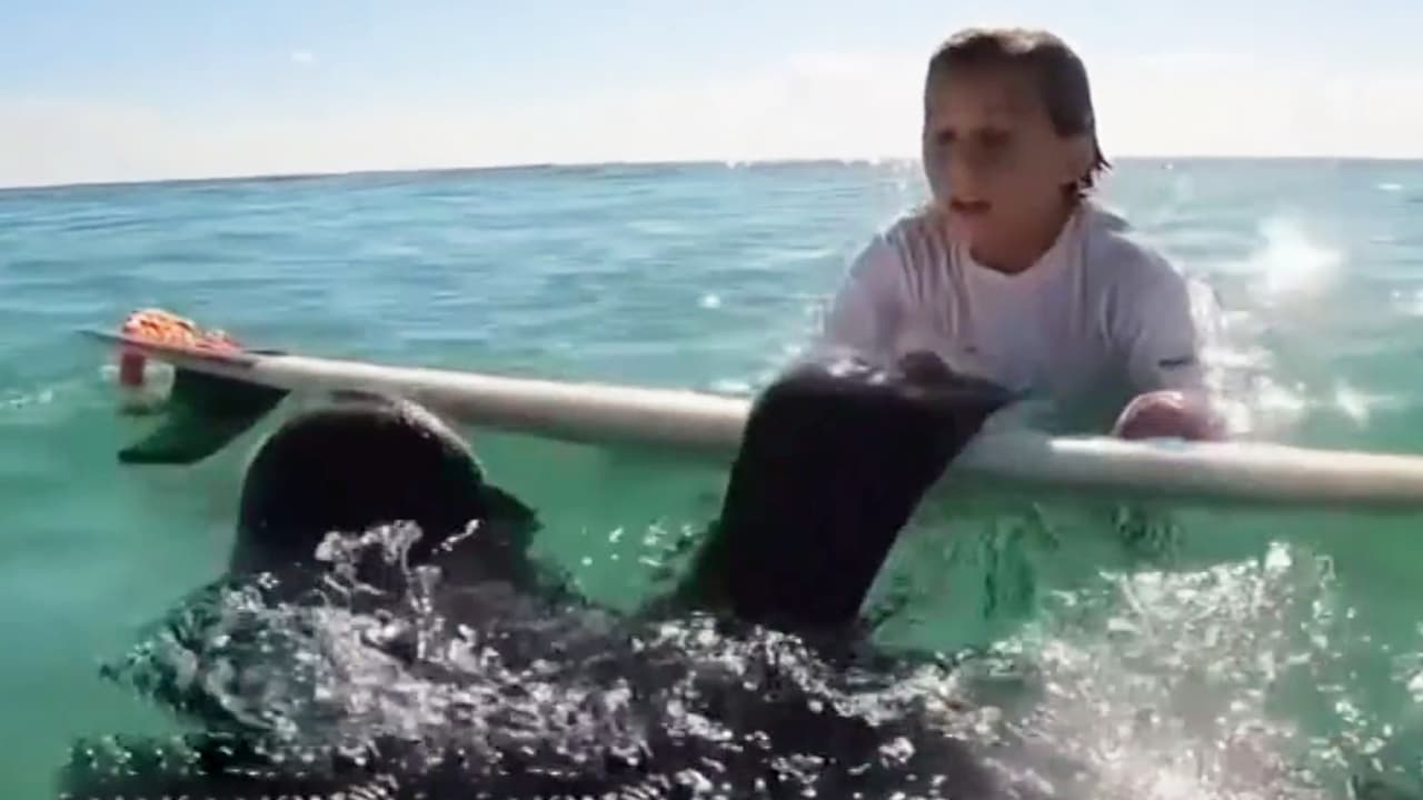 El video tomado por la madre en Fort Pierce, Florida, muestra cómo el curioso animal se acerca al niño, empuja su tabla de surf y la toma prestada con su aleta. El pequeño narró cómo esta experiencia que le causó miedo en primer lugar, se convirtió en una anécdota memorable.