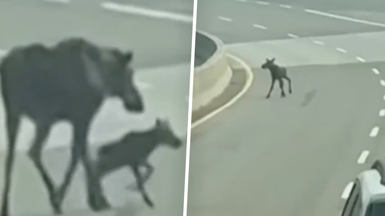 En Canadá, conductores se llevaron una sorpresa al ver a una mamá alce tratando de ayudar a su cría a cruzar la carretera, al ver que se le estaba complicado, algunas personas le ayudaron para indicarle el camino menos complicado para llegar a su destino.