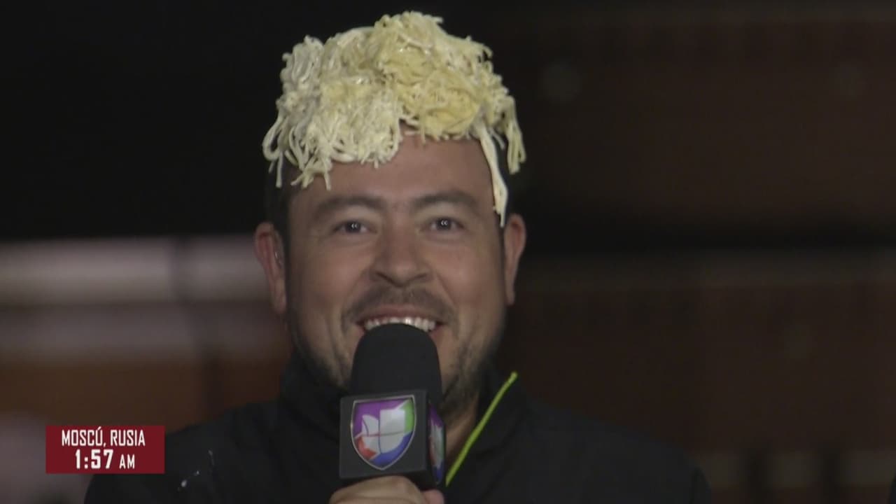 Antes de finalizar el programa, nuestro especialista debió pagar la apuesta hecha en días anteriores y tuvo que poner en su cabeza una buena porción de spaghetti.