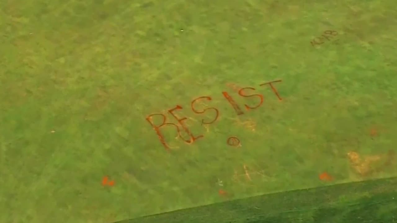Aparece una pintada gigante en un campo de golf de Trump con la palabra "resistir"