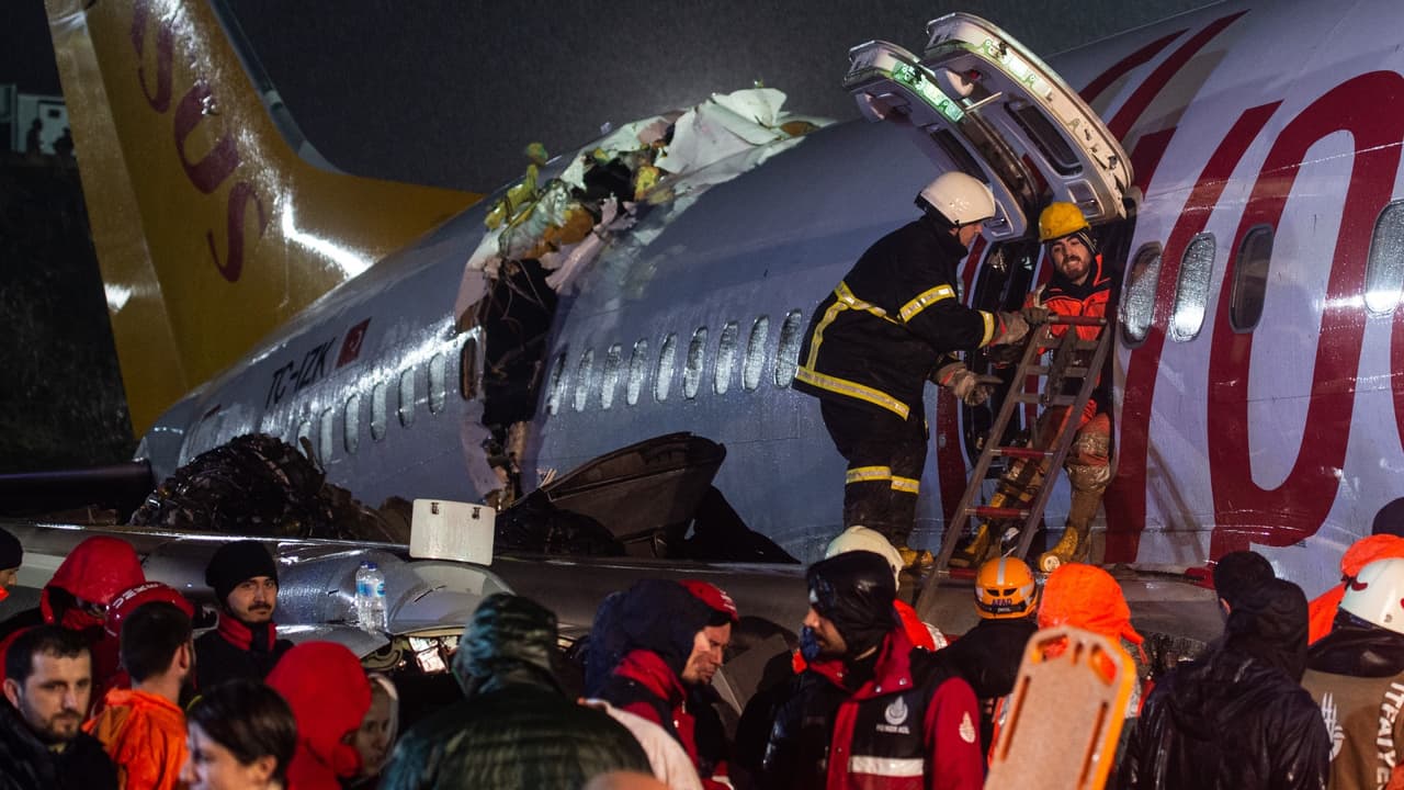 El avión de Pegasus Airlines tuvo un complicado aterrizaje debido a las malas condiciones del tiempo, se salió de la pista del aeropuerto y terminó partiéndose en tres pedazos.