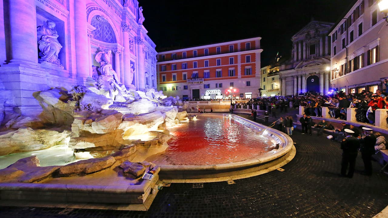 Así quedó la fuente de Trevi en Roma luego de que un activista le derramara tinta roja