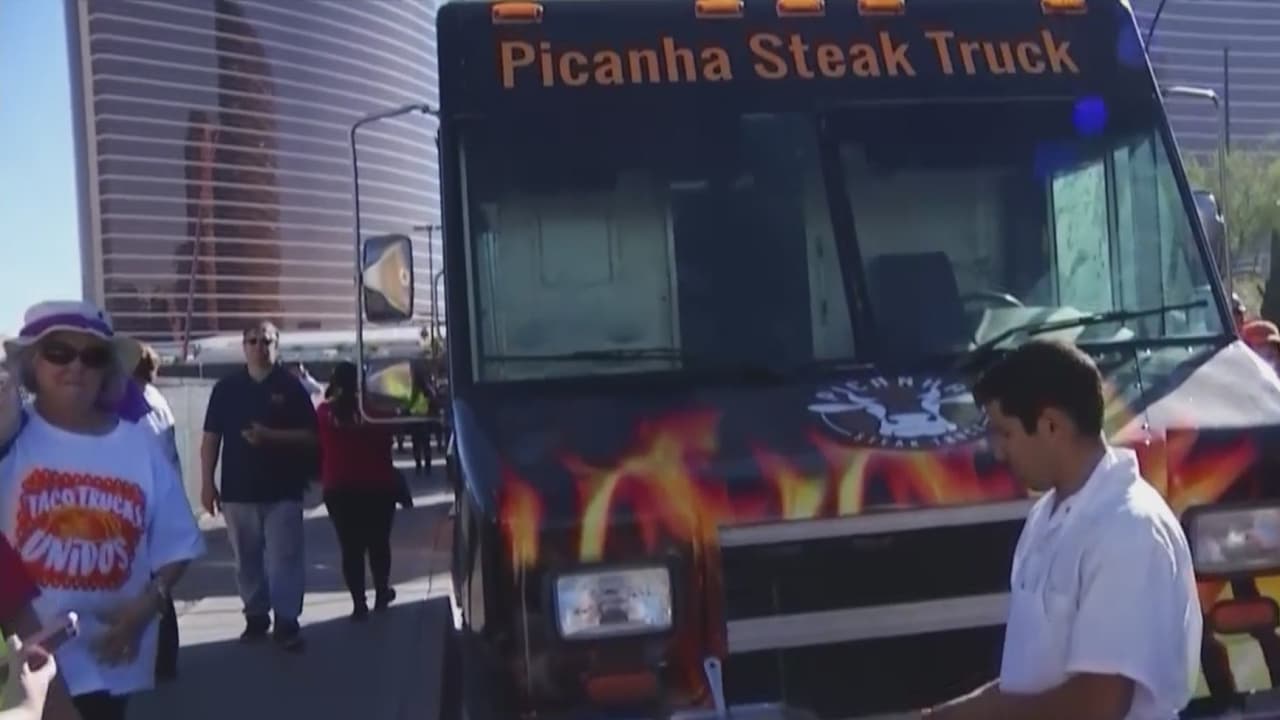 Camiones de tacos se formaron en fila, a manera de muro, frente a uno de los hoteles de Trump en Las Vegas