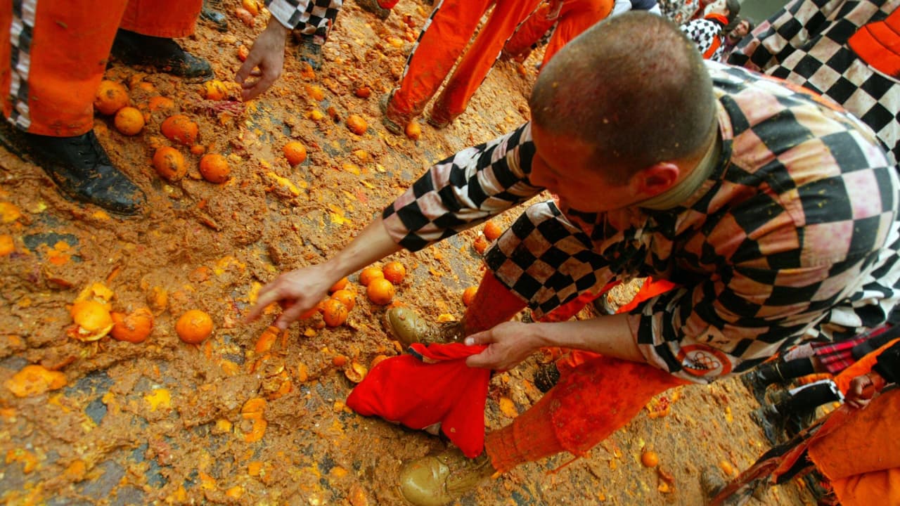 Celebran con una batalla de naranjas en el Carnaval de Ivrea, Italia