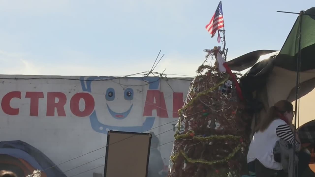 Centroamericanos de la caravana de migrantes improvisan algunos adornos para celebrar Navidad