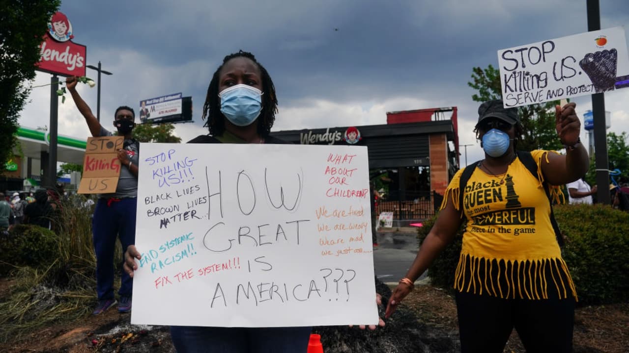 Decenas de personas, entre ellas familias enteras y niños, se reunieron en la mañana de este domingo en el estacionamiento del restaurante donde se registró el incidente que acabó con la vida de Rayshard Brooks. En esta oportunidad, a diferencia de la noche del sábado, quienes llegaron al lugar se tomaron unos minutos para orar y pedir de manera pacífica justicia en este caso.
