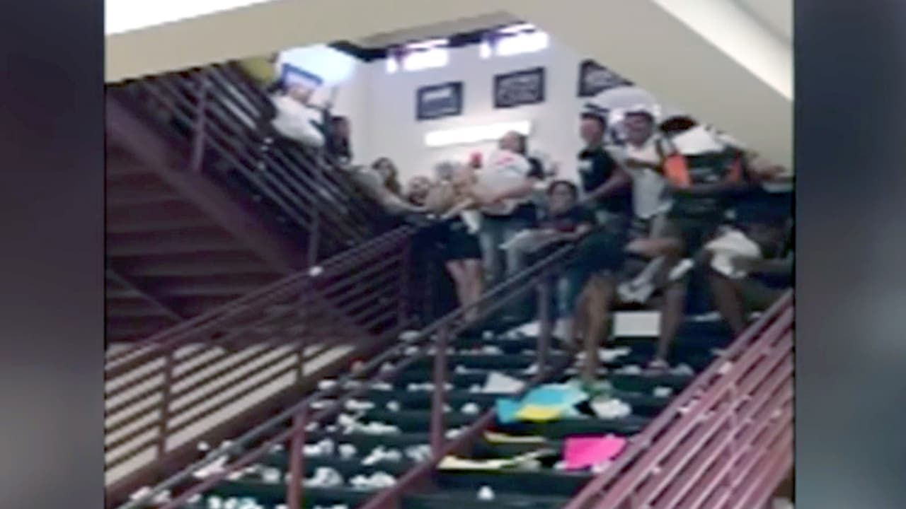 Estudiantes de Basha High School en Chandler tiran los documentos escolares por una escalera. Los encargados de recogerlos y reciclarlos son los de primer año.