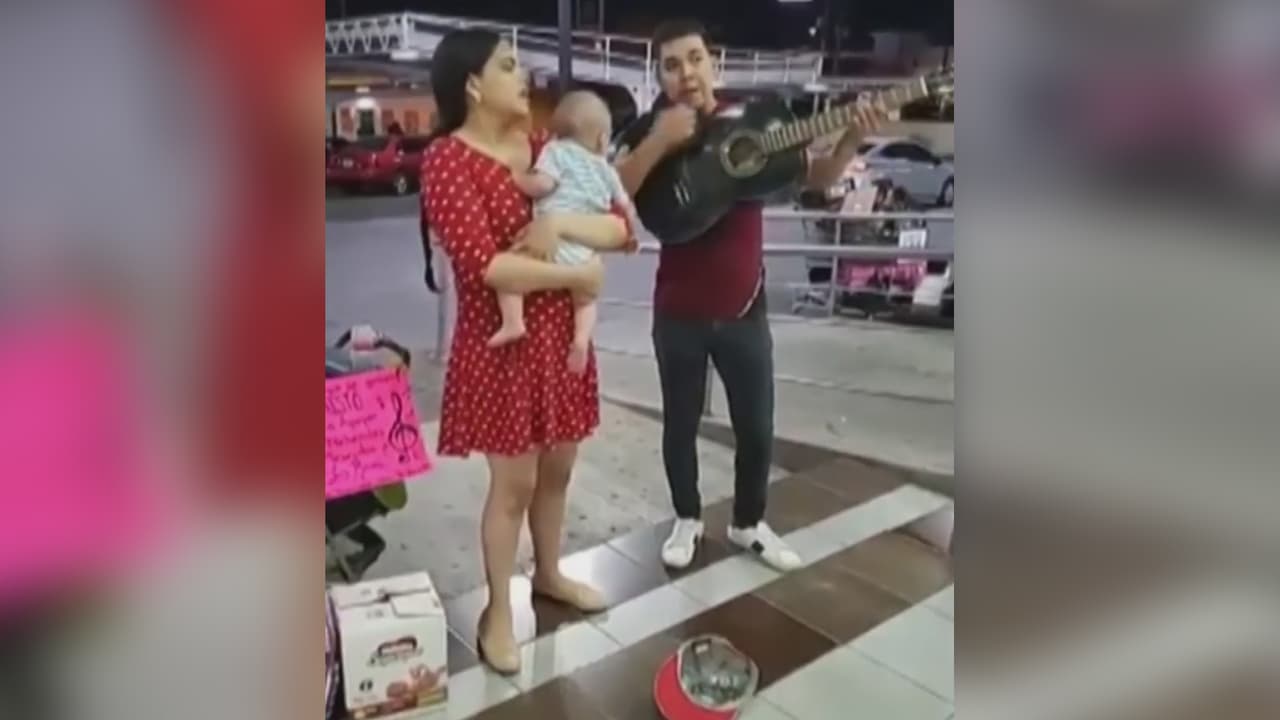 "Estábamos cantando para pagar la renta, el agua y comprarle la leche al niño", dijo Karla Mendoza, quien junto a su esposo fue grabada en un video que se hizo viral. Un pastor los invitó a cantar en las celebraciones religiosas en una iglesia y les dio techo y comida. La pareja tiene un bebé de 3 meses y ahora lleva un mensaje de esperanza a los que han perdido su trabajo.
