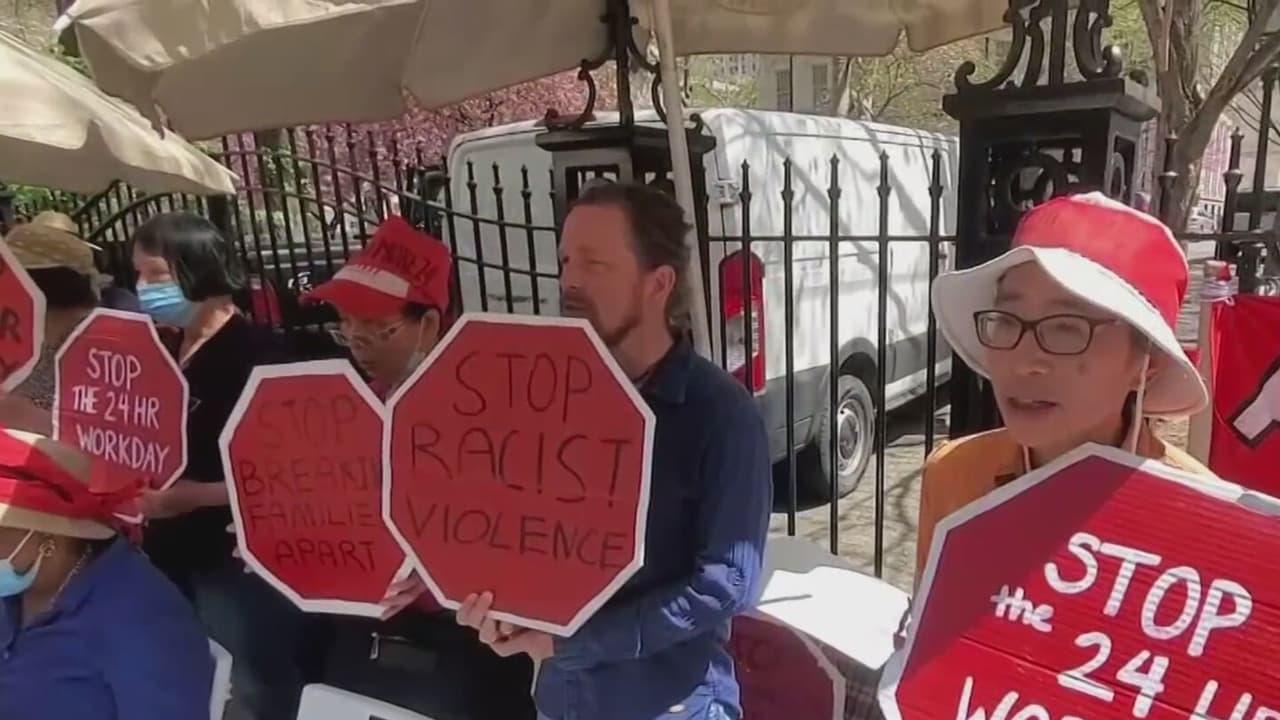 Decenas de cuidadores de ancianos y enfermos llevan tres días manifestándose en las afueras de la municipalidad de Nueva York en contra de las jornadas de 24 horas. De acuerdo con su relato, las agencias que los contratan no les pagan por todas las horas trabajadas. Es por esto que le piden a las autoridades locales apoyar el proyecto de ley “No más 24” propuesto por el concejal Christopher Marte.