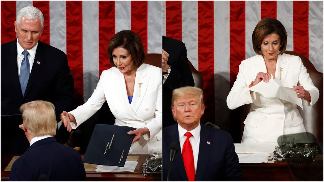 Un día antes de que el Senado vote sobre los dos cargos que enfrenta el presidente Donald Trump en el juicio político, muchos observadores estaban pendientes del momento en que el mandatario se encontrara con la presidenta de la Cámara de Representantes en el Capitolio, instantes que estuvieron llenos de tensión.
