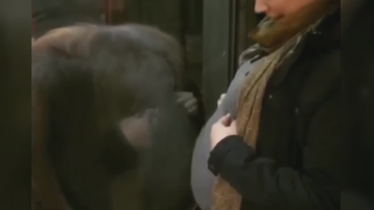 El cariñoso beso de un orangután a una mujer embarazada a través del cristal