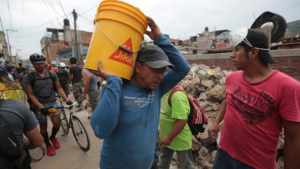En las calles de la capital mexicana, los voluntarios esperan en fila para entrar a los edificios colapsados a remover escombros. Otros traen comida y recogen víveres para los necesitados.
