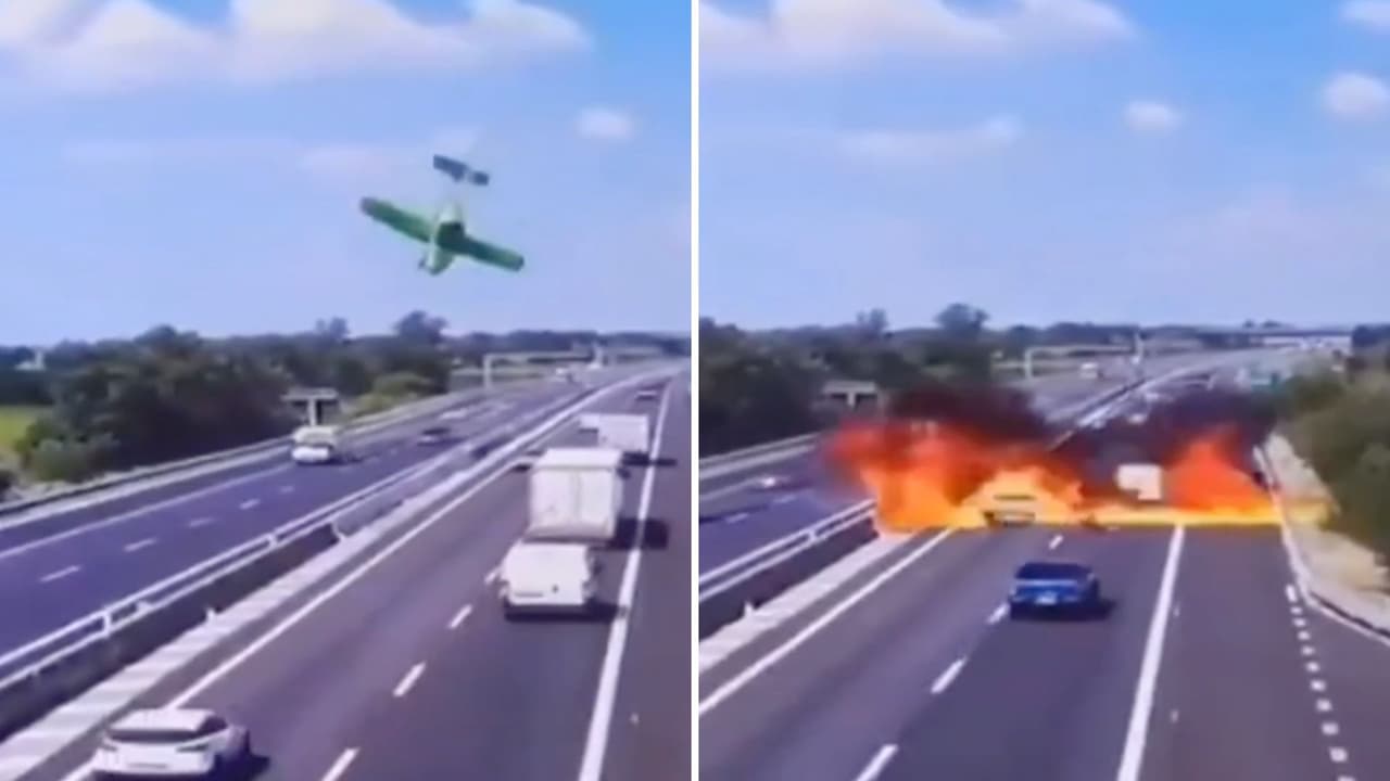 El momento en que una avioneta se estrella en una autopista y explota: dos personas murieron