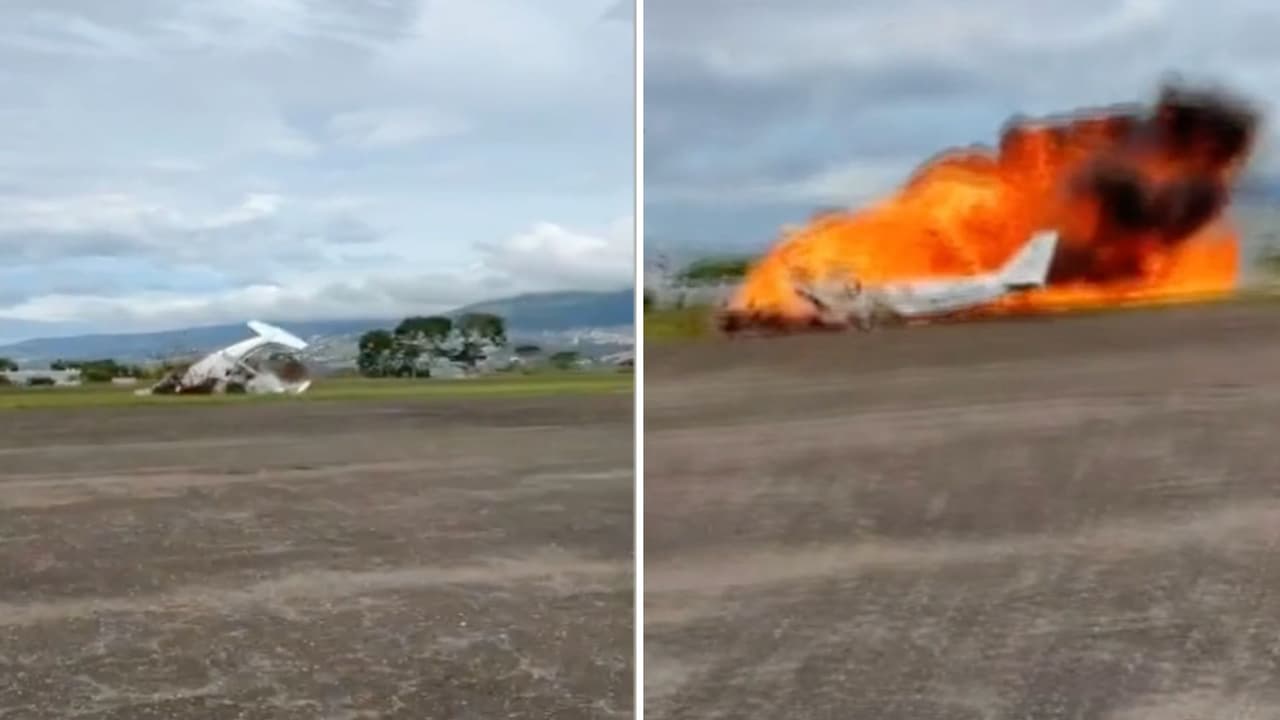 En video quedó captado el momento en que una avioneta se estrella y explota segundos después de despegar en Táchira, Venezuela. El accidente cobró la vida del piloto y del copiloto. La principal hipótesis es que uno de los neumáticos de la aeronave estalló durante el despegue.