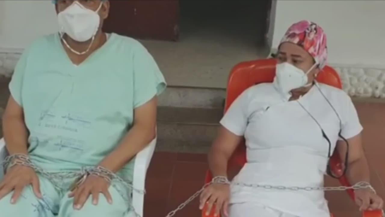 Encadenados y en huelga de hambre: así protestan trabajadores de la salud en un hospital de Colombia