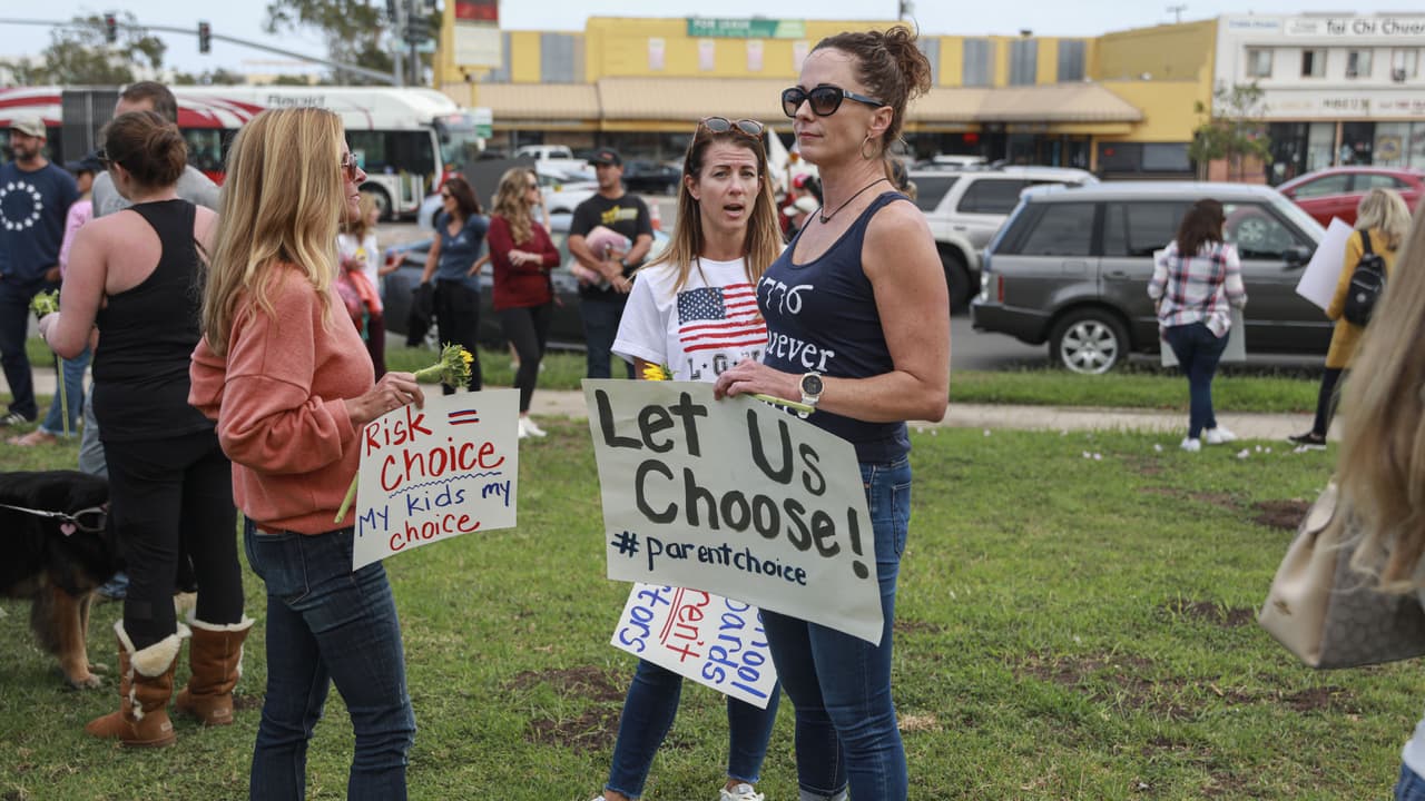 Cientos de padres de familia protestaron en varias ciudades de California contra la orden del gobernador Gavin Newsom que exige que todos los estudiantes elegibles reciban la vacuna contra el covid-19. Promotores de la protesta pidieron a los padres mantener a sus hijos en casa o sacarlos de clases para expresar su rechazo a la medida.
