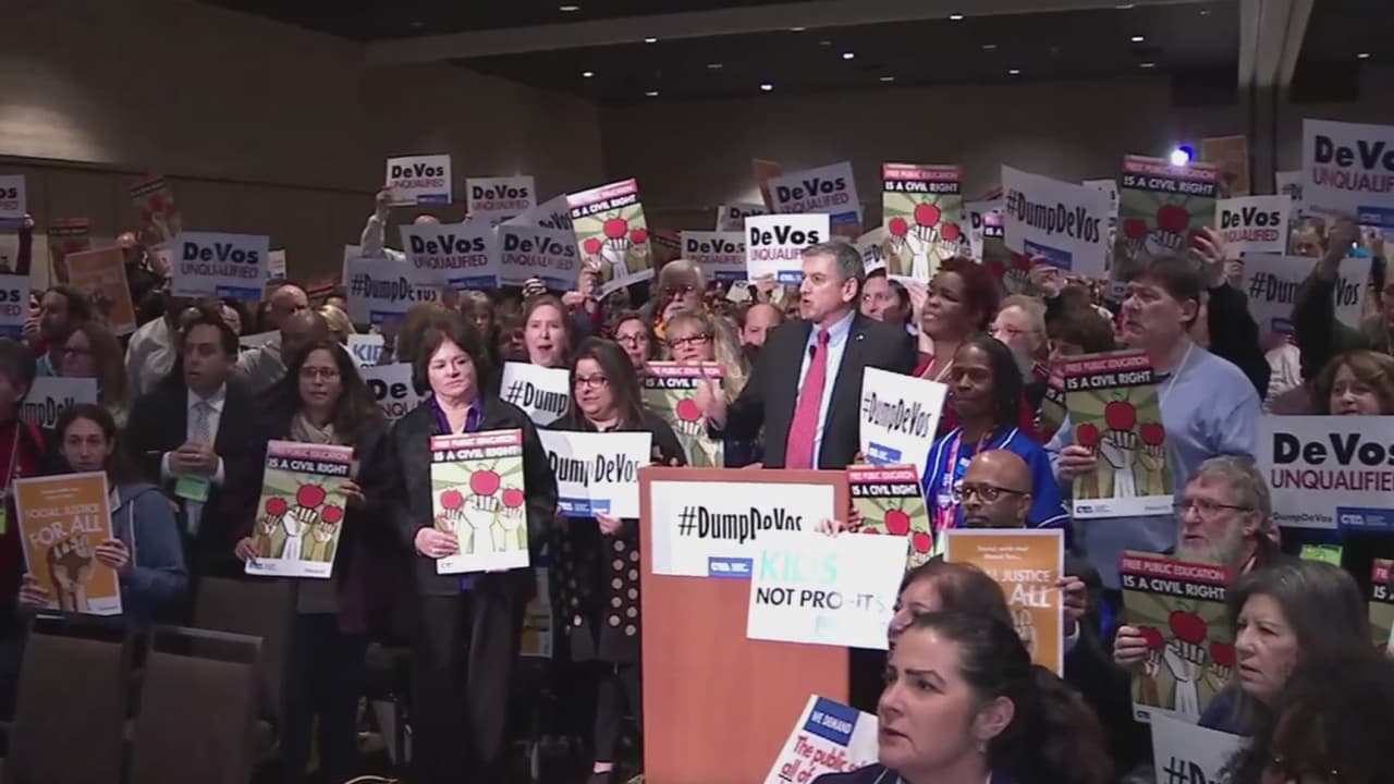 Integrantes de la asociación están decididos a proteger el avance de la enseñanza pública y los derechos de los alumnos. Critican que Betsy, empresaria multimillonaria, no tiene experiencia en el sector.