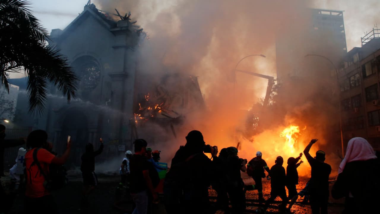 Lo que empezó como una protesta pacífica pasó a ser un enfrentamiento violento entre las autoridades y algunas personas que quemaron parte de la iglesia de Carabineros y destruyeron una estación de policía en el norte de Santiago de Chile.