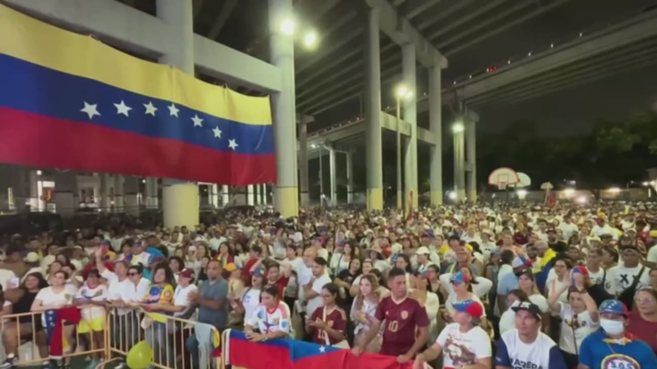 Miles de venezolanos llegaron al parque Jose Marti, en Miami, para esperar juntos los resultados de las elecciones presidenciales que marcarán el futuro de Venezuela. A pesar de la lluvia, los asistentes han manifestado que se mantendrán en ese lugar en solidaridad con sus connacionales que permanecen en los puestos de votación.