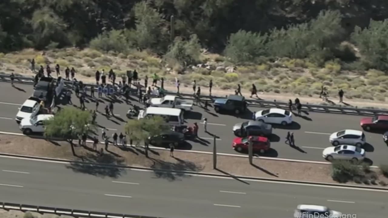 Decenas de defensores de los derechos migrantes bloquearon el tráfico en Arizona, evitando que Trump pudiera llegar.