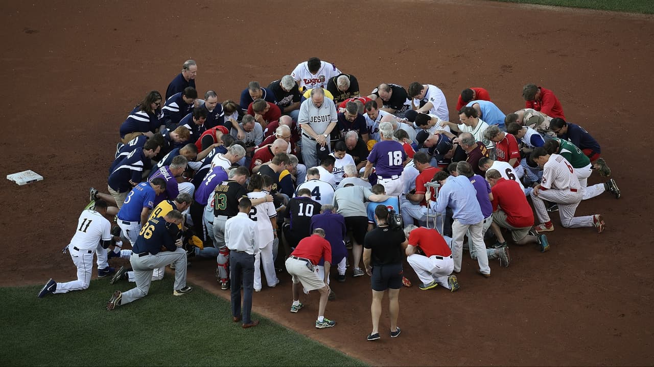 Antes de comenzar el partido, algunos congresistas se arrodillaron y rezaron por sus colegas. Uno de los héroes que evitó la tragedia en Alexandria, Virginia, fue el encargo de realizar el saque de honor del partido.
