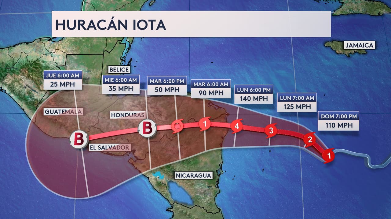 Iota avanza como huracán de categoría 1, pero se espera que aumente a categoría 4 antes de tocar tierra en Centroamérica la noche de este lunes, según pronostica Albert Martínez, meteorólogo de Univision. Toda la zona se encuentra en máxima alerta por el poder de este fenómeno que ya deja muchas lluvias e inundaciones.