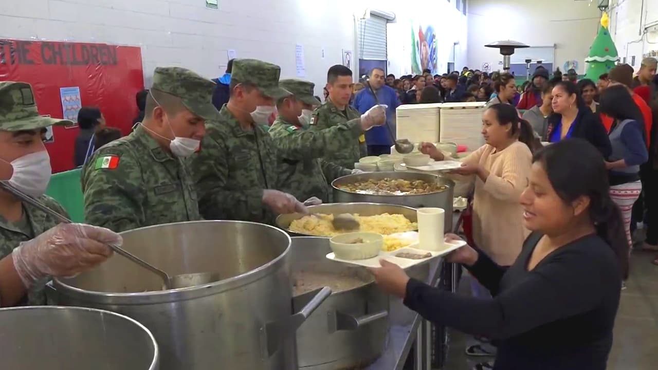 Soldados mexicanos cocinan para cientos de migrantes en un albergue de Ciudad Juárez