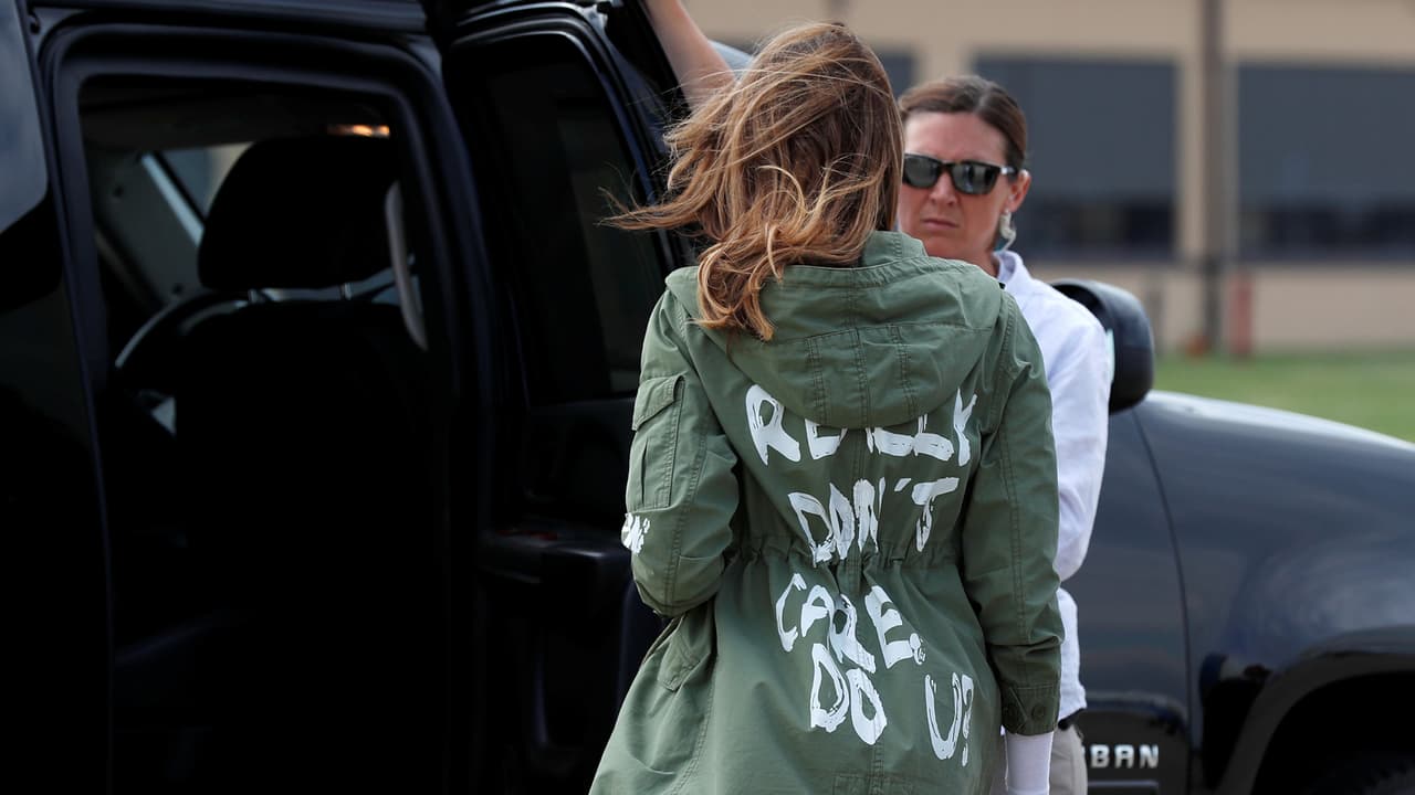 La primera dama desató una ola de críticas luego que saliera a la luz una fotografía que la mostraba usando una chaqueta verde militar con la frase: "Realmente no me importa, ¿a ti sí?", previo a su viaje a Texas, donde fue a visitar un centro de detención en el que están recluidos decenas de menores inmigrantes que fueron separados de sus padres.
