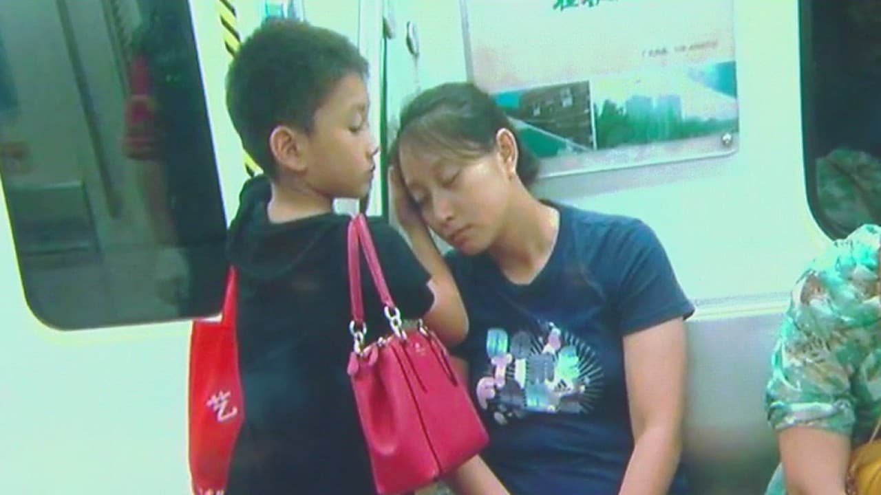 Un niño chino da ejemplo de ternura y compasión cuidando el sueño de su madre cansada en el metro