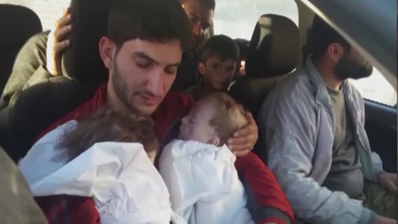 Un padre carga en brazos los cuerpos de sus dos hijas gemelas, fallecidas en el "ataque químico" de Siria