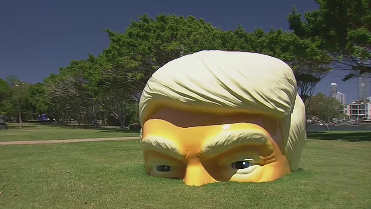La obra de arte que se encuentra en Queensland, Australia, tiene por una lado la cara del mandatario medio enterrada en el suelo y por el otro una especie de parada de autobús envuelta en llamas.