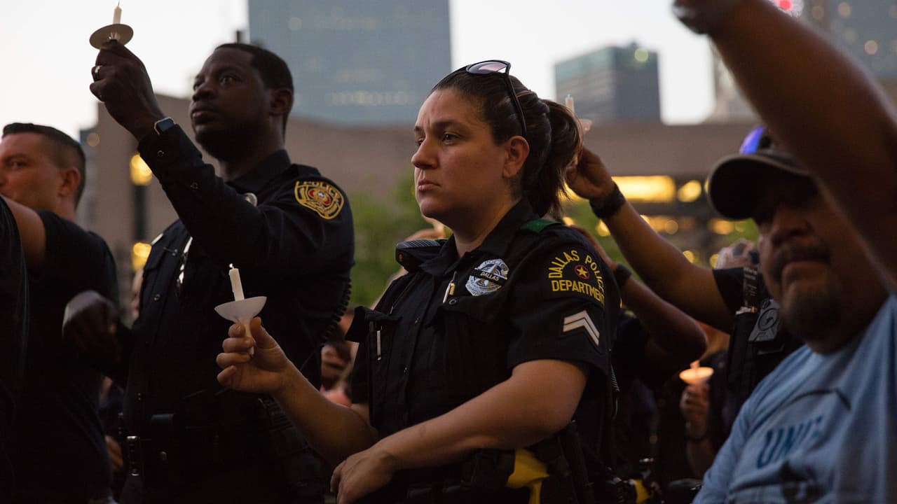 La vigilia fue solicitada frente a la sede del Ayuntamiento de Dallas y los agentes compartieron con los asistentes, quienes fueron recibidos con una vela y los nombres de los oficiales caídos.