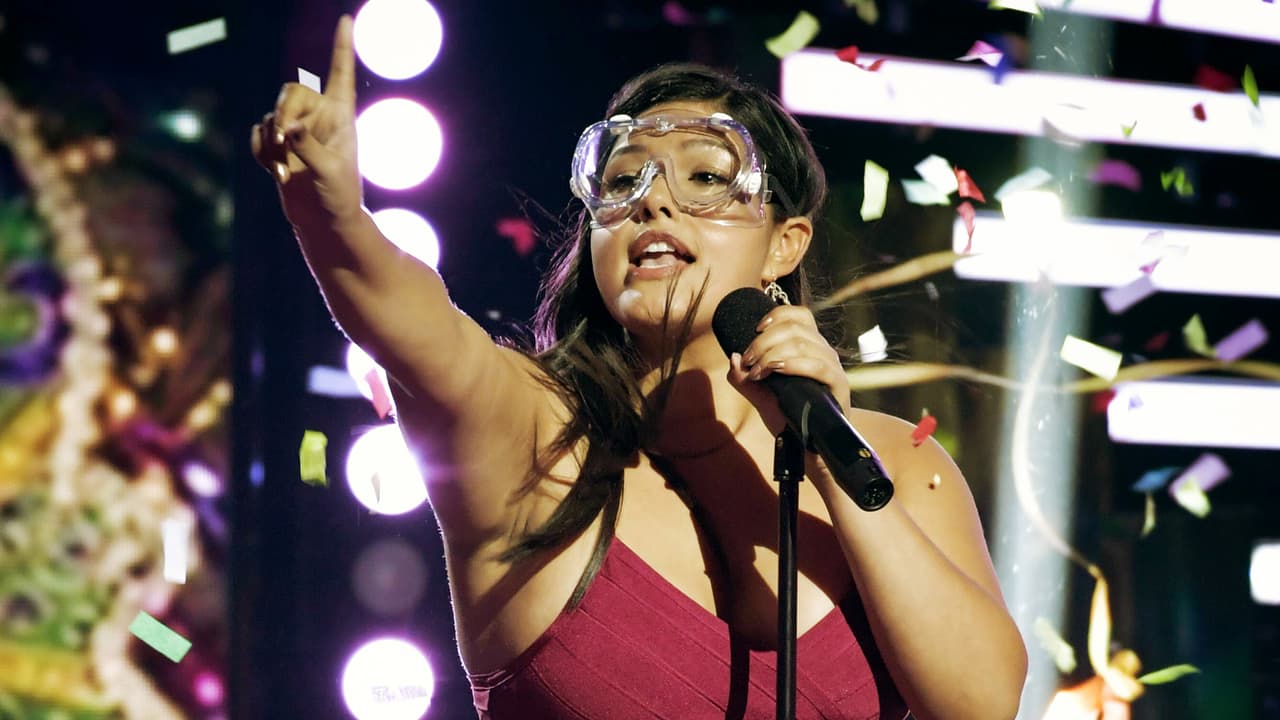 La mexicana se ganó la admiración del jurado al cantar este éxito de Celia Cruz mientras le llovían todo tipo de cosas encima.