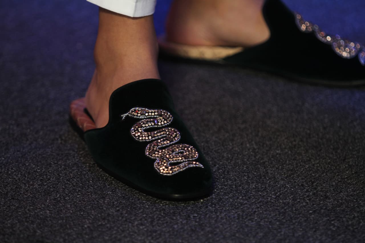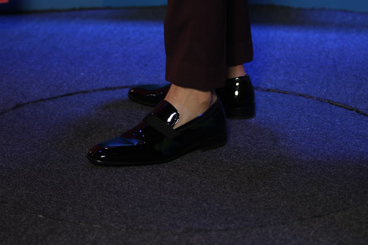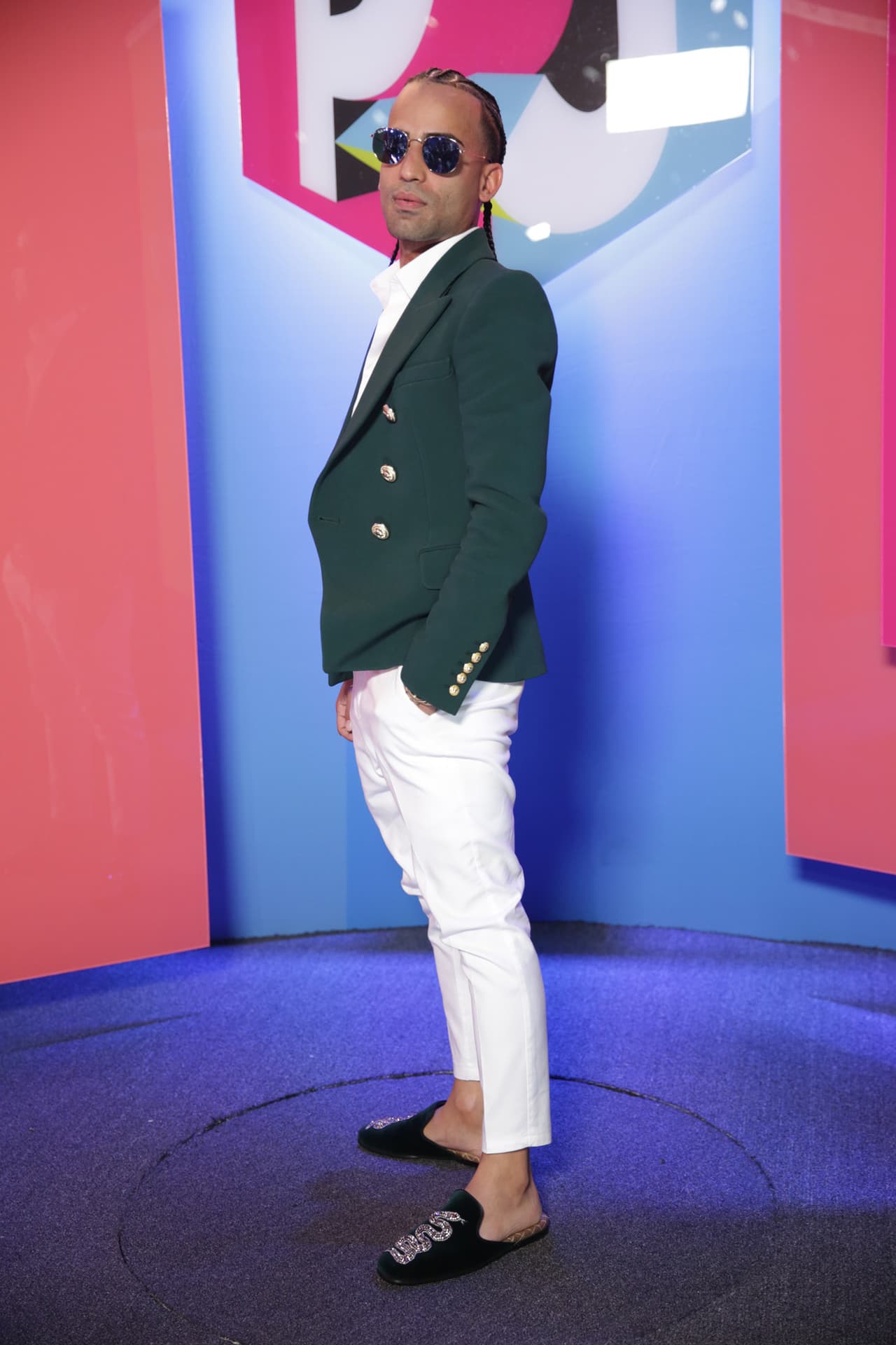 El look de Arcángel se distinguió por trendy y veraniego. Lució una chaqueta en verde seco de doble botonadura, pantalones capri y camisa blanca y remató con unos espectaculares slippers negros de terciopelo de Gucci.