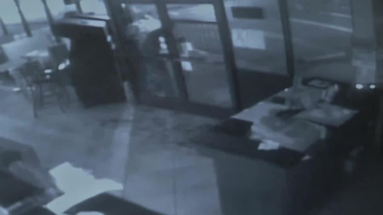 A patadas, ladrón destroza la puerta de cristal de una pizzería para entrar a robar en California