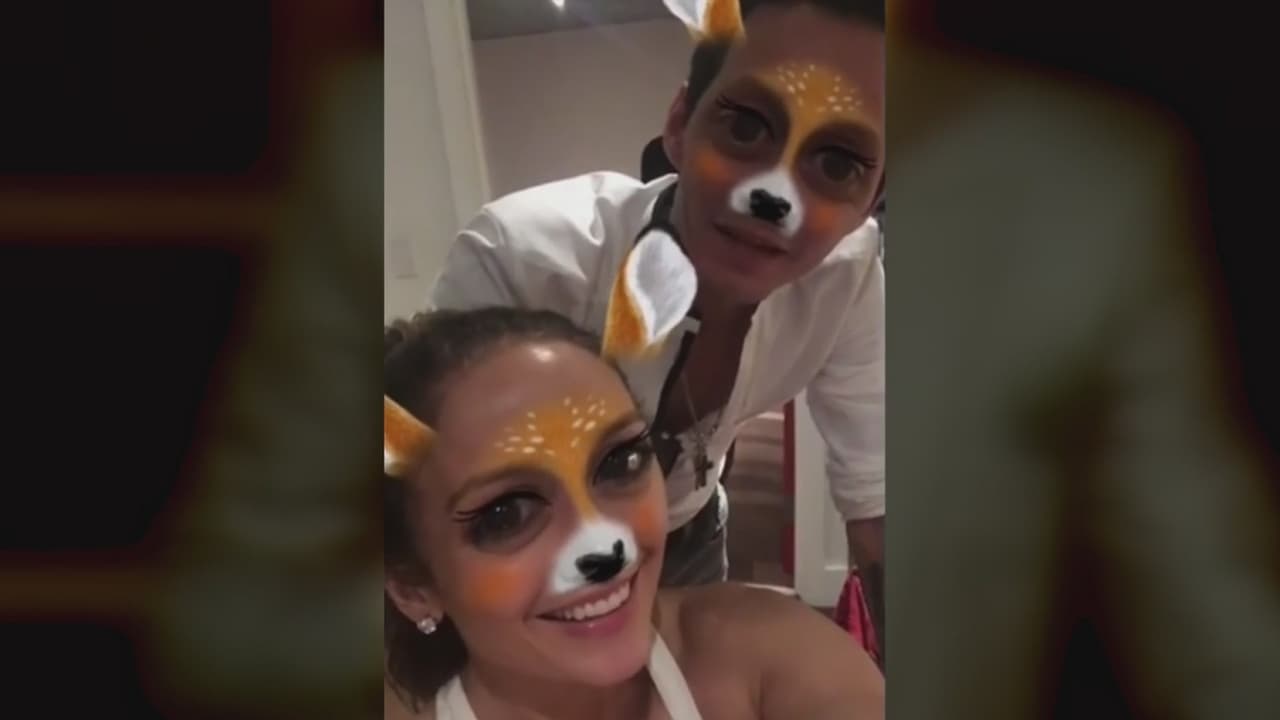 Usando el filtro de una famosa aplicación los artistas sonríen y bromean juntos. Ellos se encontraban trabajando en un estudio grabando el nuevo proyecto de Jlo.