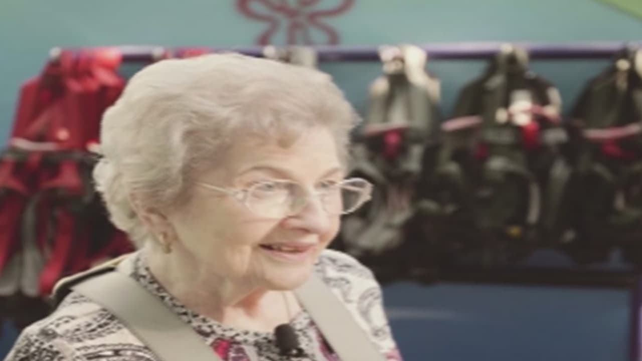 A sus 93 años de edad la intrépida mujer se deslizó por un tubo, a varios pies de altura, atada con un arnés, en un centro comercial en Minnesota. Su increíble hazaña provocó la ovación de los perplejos testigos.