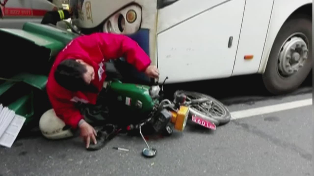 Atrapado bajo un autobús quedó el conductor de un mototaxi en China tras chocar contra el vehículo