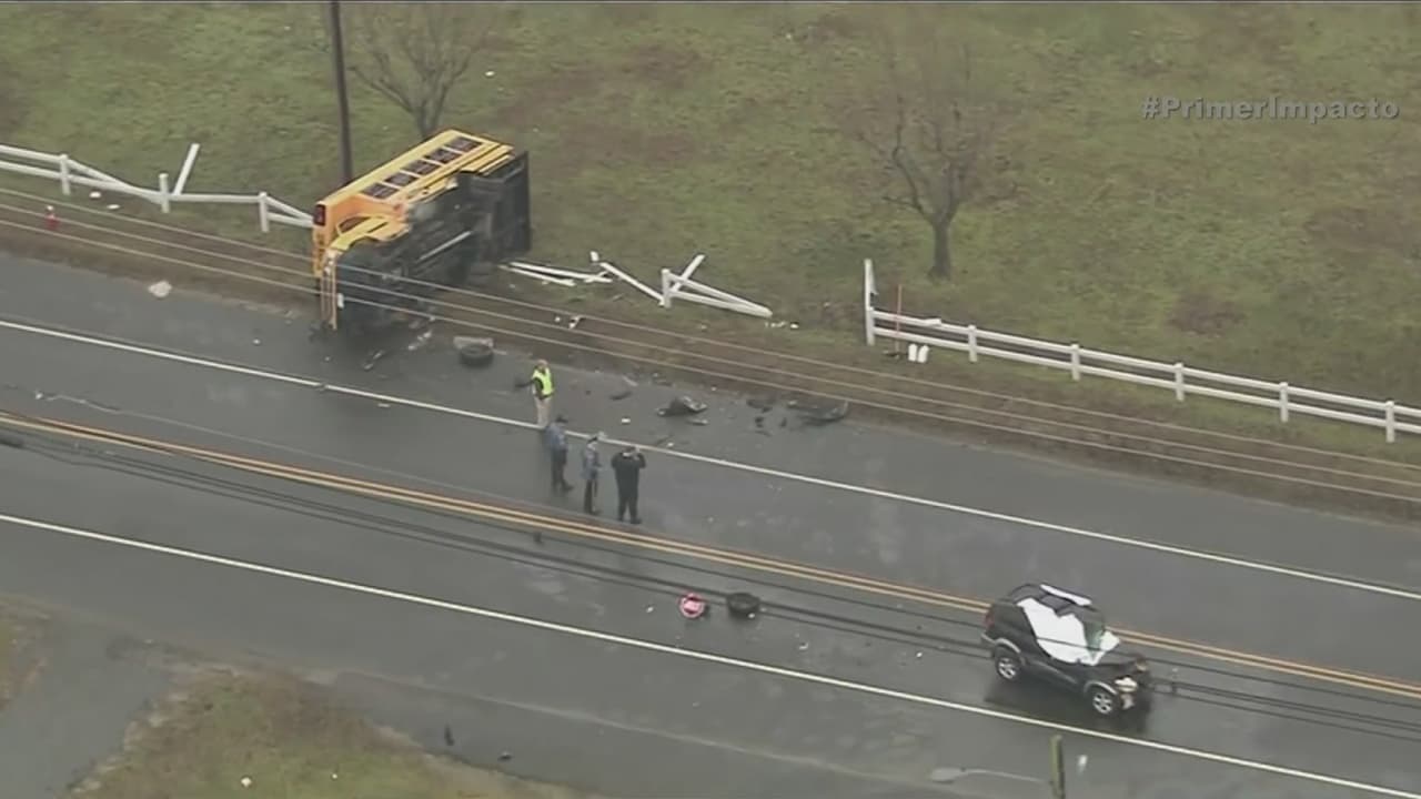 Autobús escolar impacta con una furgoneta y vuelca a la orilla de la vía