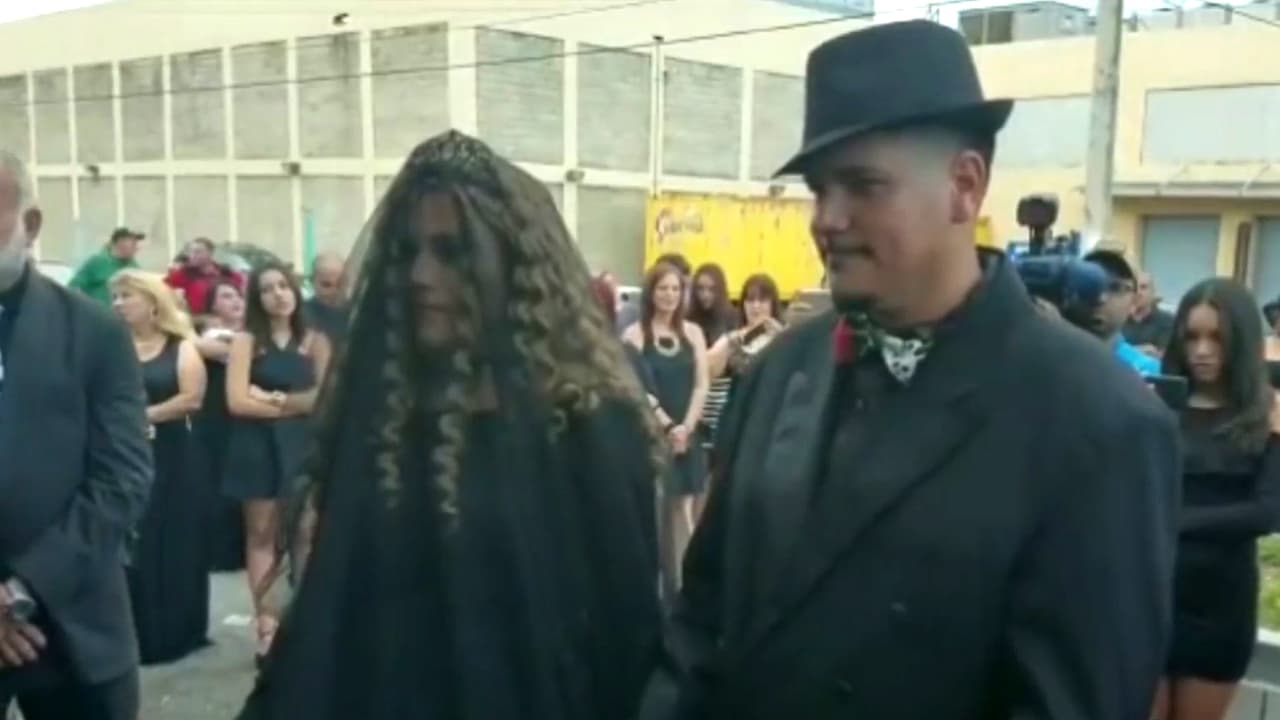 La pareja escogió como escenario para este día tan especial un cementerio de Puerto Rico. Un féretro sirvió de mesa en la ceremonia y la novia llegó en un auto fúnebre.