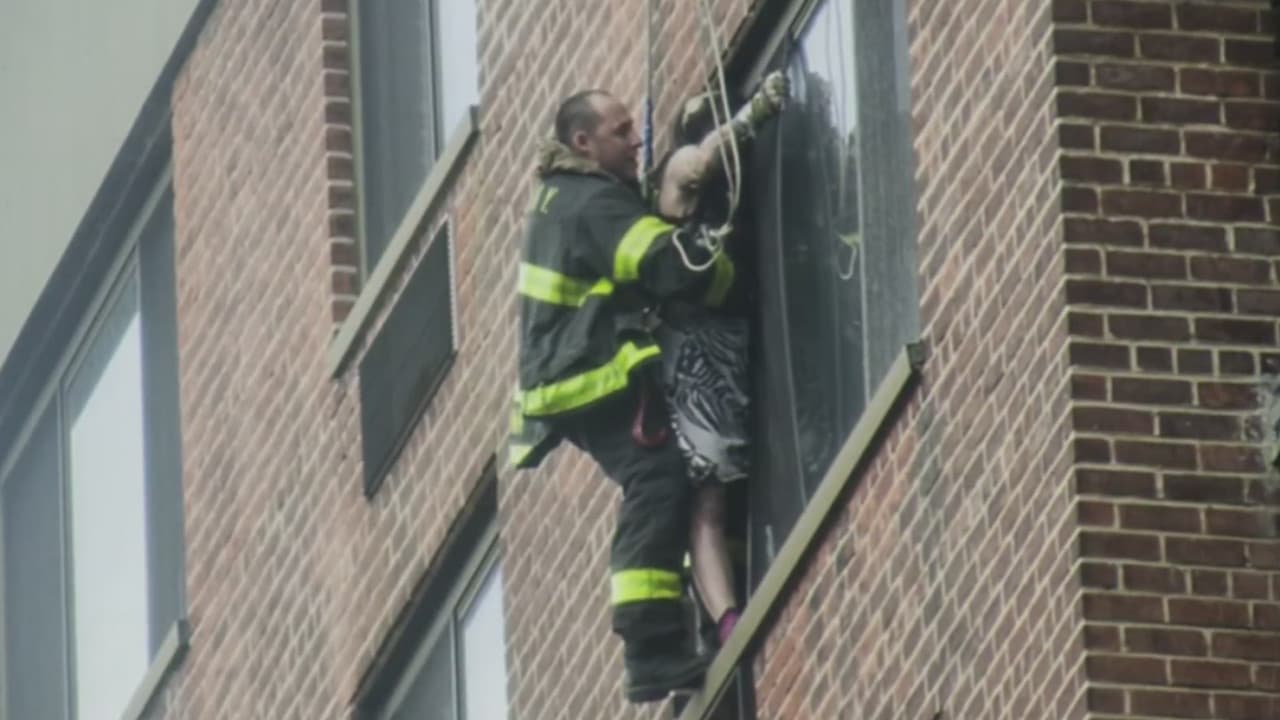 En video quedó grabado como el hombre utilizó una complicada técnica para rescatar a la mujer que estaba en la ventana de un edificio en Nueva York.