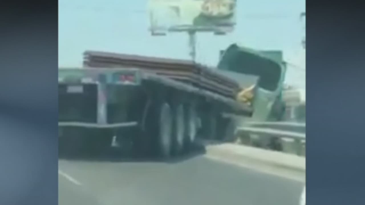 El exceso de velocidad provocó que el vehículo chocara contra otro camión y cayera por el puente. La carga que portaba causó destrozos en la carretera.