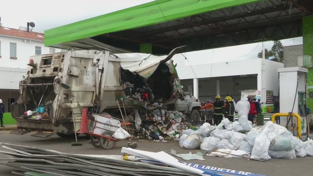 Camión de basura explota en una gasolinera y lanza una lluvia de desperdicios