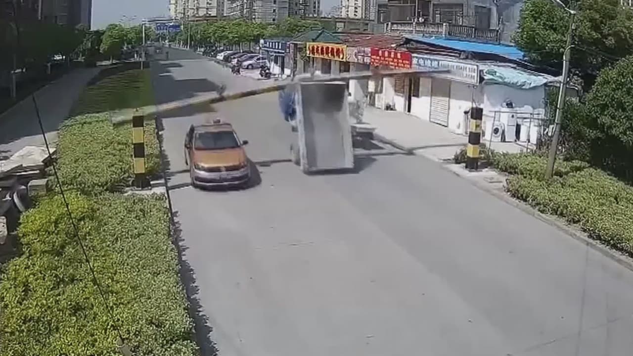 Camión de carga no consiguió pasar por debajo de una barrera y acabó partiéndola en pedazos en China